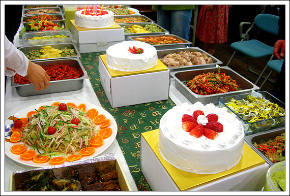 우리 교회는 아주 작습니다.. 주일 출석 교우가 50명 넘기가 조금 버거운 수준의 아주 작은 교회입니다.. 그래서 그런가 교인 한 사람 한 사람이 그저 가족 같은 느낌이 강한 유대감이 있습니다.. 그리고 이렇게 늘 축일이나 기념일이 다가오면 가족별로 한가지 음식을 해와서 모두가 나눠 먹는 파티를 즐기곤 합니다.