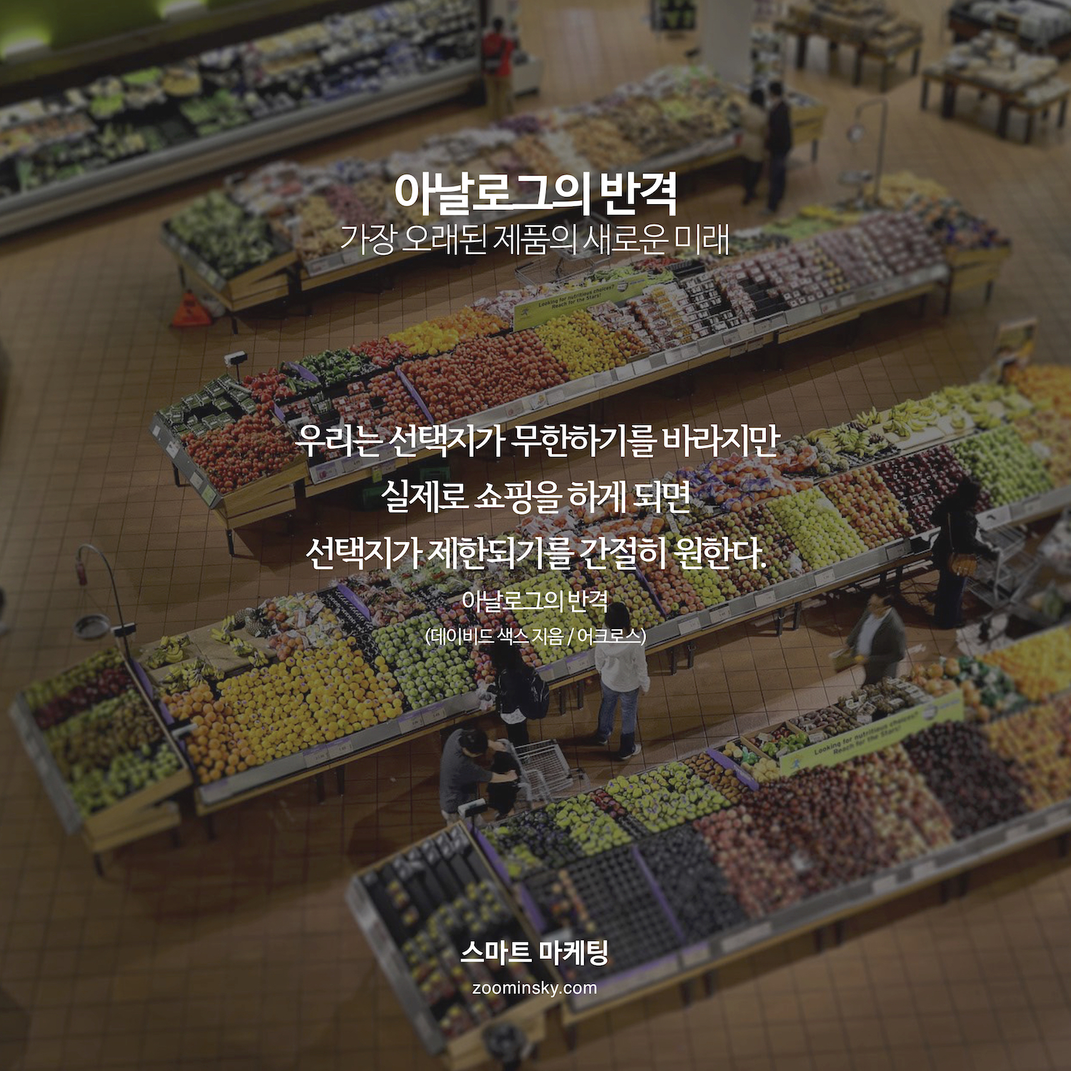 사람들은 분석할 때 많은 소비자가 다양한 상품을 보길 원한다고 믿지만, 반대로 그 선택지가 일정한 수준을 넘어설 경우 오히려 혼란을 부치기고 구매를 미루는 결과를 낳을 수도 있다는 것입니다. 수많은 플랫폼의 선택과 그 플랫폼 내에서의 수많은 상품의 선택지는 현대 소비자에게는 오히려 공해처럼 느껴집니다. 그래서 분석하길 소비자는 선택이 다양하길 원하지만 실제로 물건을 살 때는 제한되길 원한다는 것입니다. 이게 실제 포인트입니다. 이걸 어떻게 만족시킬지? 새로운 쇼핑 플랫폼 혹은 서비스로? 아니면 쇼핑몰의 자체 프로세스로? 아니면 광고/마케팅 단계에서? 아니면 상품을 진열하거나 설득하는 카탈로그 과정에서? 사실 어디에서나 가능한 부분이 있다고 생각됩니다. 우리는 이 관점을 꾸준하고 진지하게 고민해봐야 합니다.
