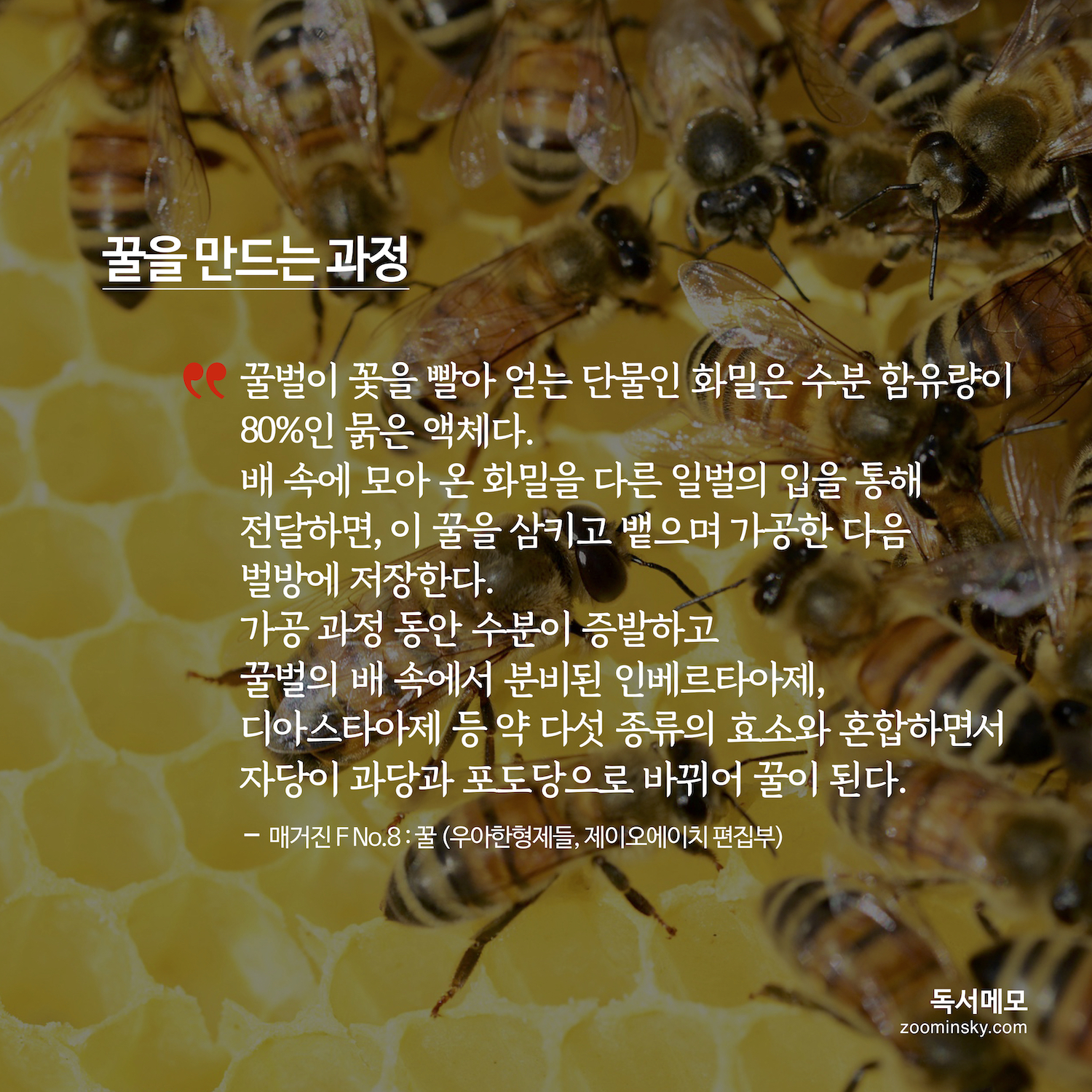 꿀벌이 꽃을 빨아 얻는 화밀은 수분 함량이 80%인 묽은 액체다. 배 속에 모아 온 화밀을 다른 일벌의 입을 통해 전달하면, 이꿀을 삼끼고 뱉으며 가공한 다음 벌방에 저장한다. 가공 과정 동안 수분이 증발하고 꿀벌의 배 속에서 분비된 인베르타아제, 디아스타아제 등 약 다섯 종류의 효소와 혼합하면서 자당이 과당과 포도당으로 바뀌어 꿀이 된다. - 매거진 F No.8 : 꿀 (우아한형제들, 제이오에이치 편집부)