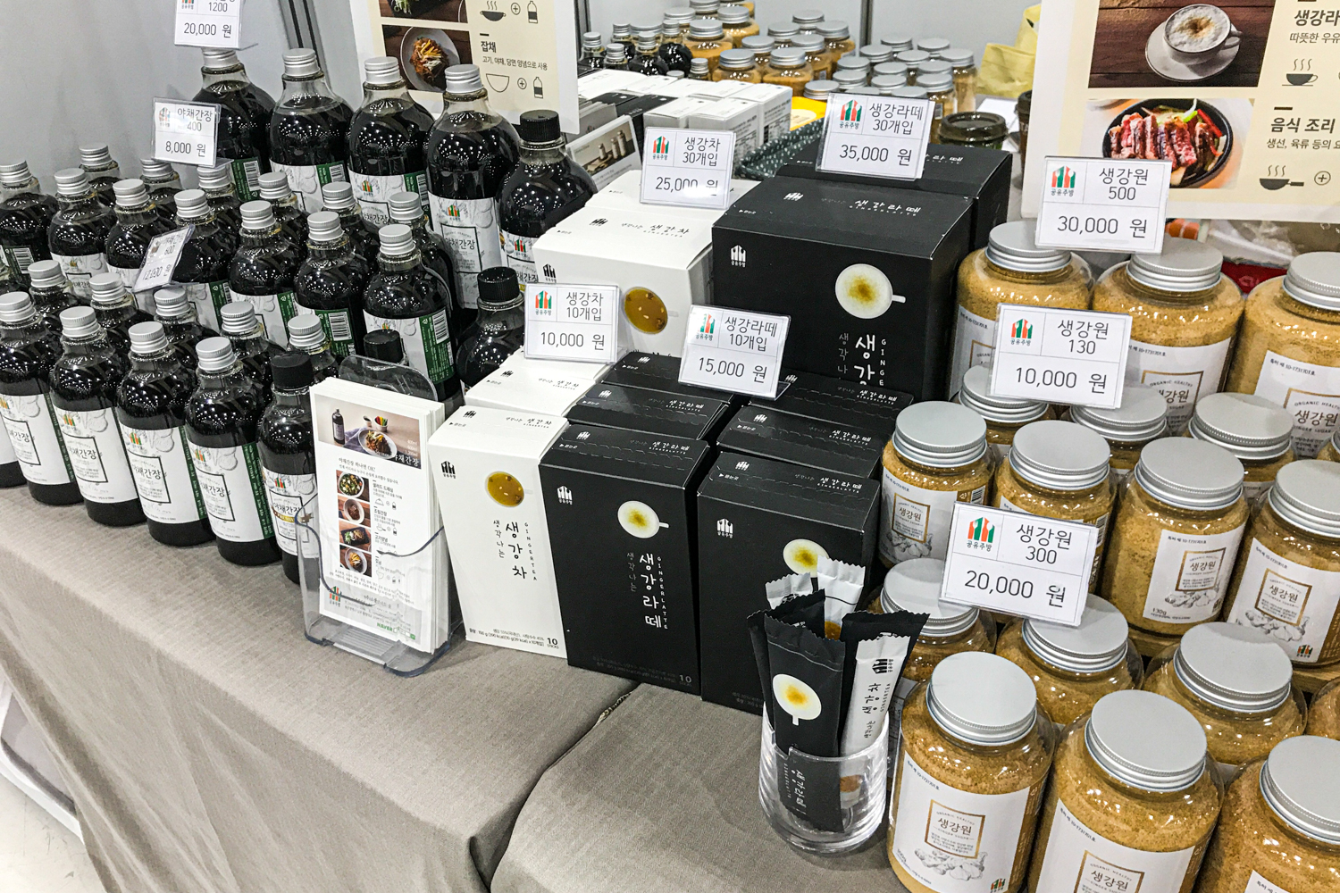 마지막으로 전시회를 나오기 전에 눈에 들어온 것은 생강차, 생강라떼 그리고 야채 간장이라는 것이었습니다. 보통은 생강청으로 액상타입인데 여기는 그것을 가루 형태로 구현을 했습니다. 즉, 청을 한번 더 가공한 제품이죠. 그렇게 해서 스틱형으로 뽑으니 아주 괜찮더군요. 맛도 좋았습니다. 그런데 개인적으로는 생강라테가 아주 맛있었습니다. 그리고 야채간장은 간장을 가공해서 맛간장으로 사용할 수 있게 만든 건데 간장 자체가 맛있더군요. 요것도 활용을 고민해보면 좋을 듯합니다.