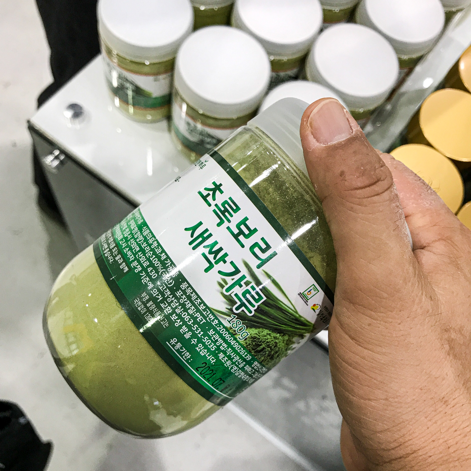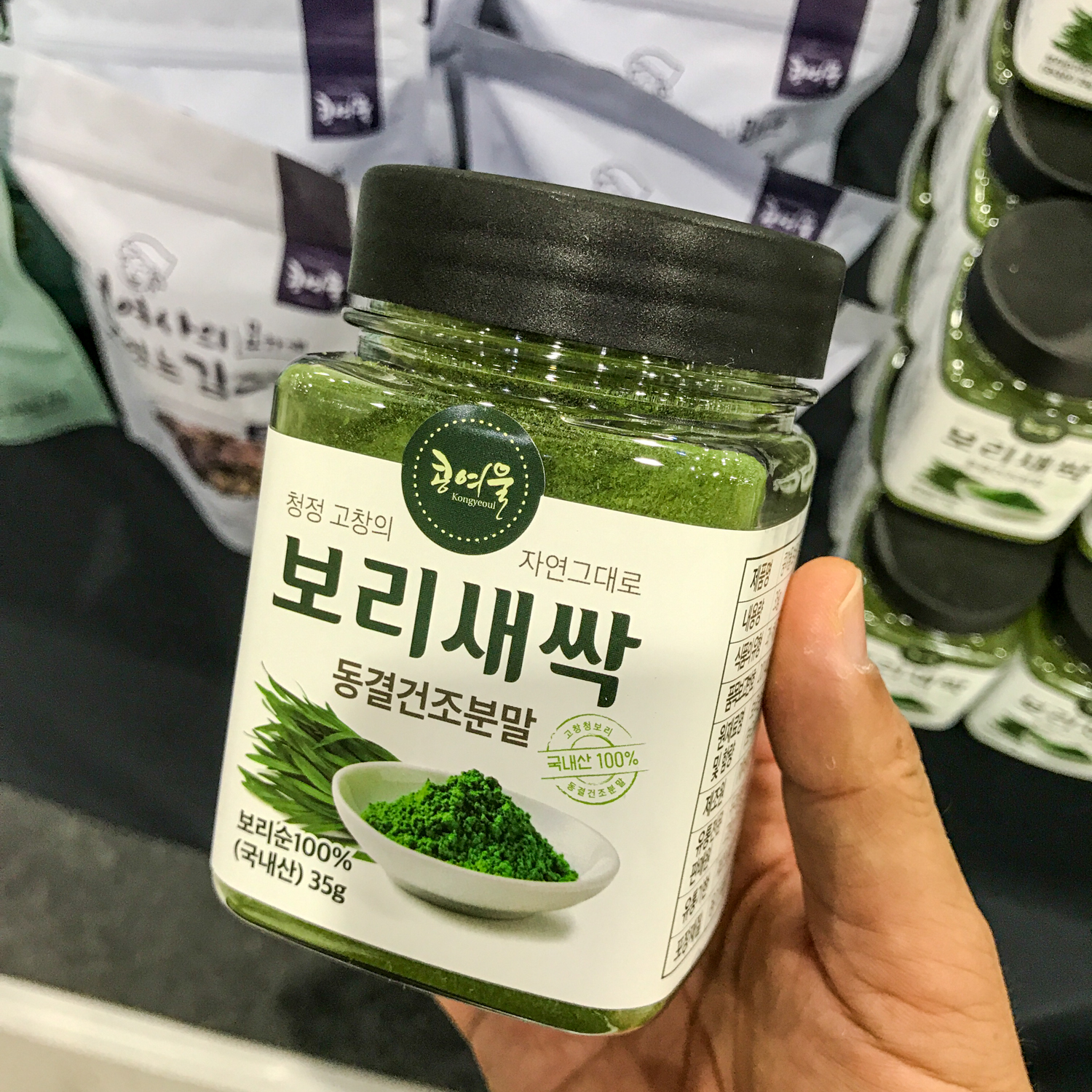 그 와중에도 내 감에 와 닿는 물건들은 있더군요. 최근 파우더 제품을 많이 보고 다니는 중인데 그런 종류의 파우더가 꽤 있었습니다. 거의 모든 것을 파우더 형태로 동결건조방식으로 만들어서 우유나 두유에 타 먹을 수 있도록 해놓은 제품들이 저는 관심이 갔었는데 새싹보리 제품들은 일단 현재는 물량이 힘들다고 하더군요.