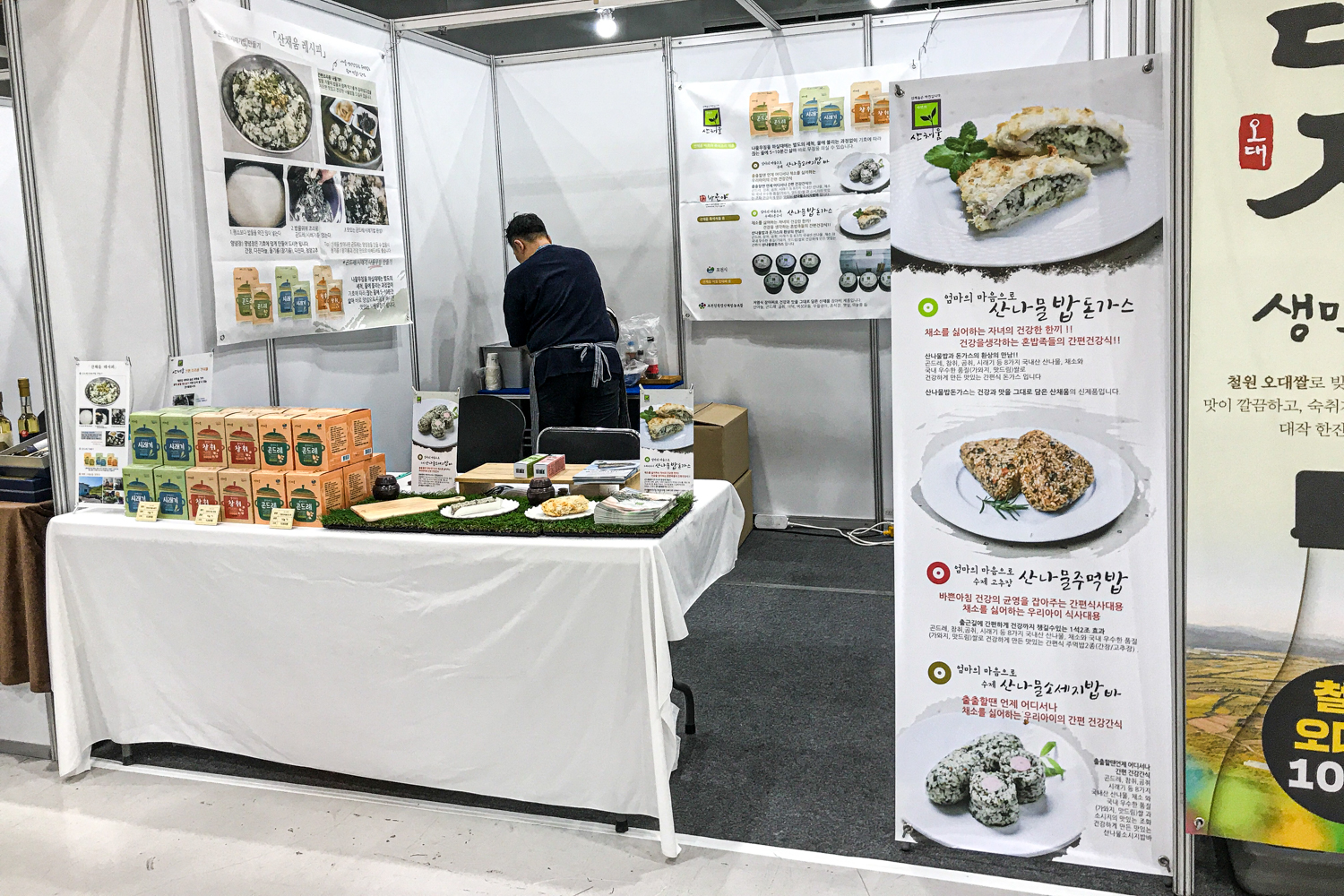 또 하나는 나물밥을 기반으로 하는 돈까스와 밥스틱이었습니다. 와디즈에서 펀딩에 성공한 제품이라고 하시던데 이제 다음 달에 출시를 앞두고 있다고 합니다. 워낙 여러 곳에서 물건을 달라고 난리라고 하는데 걱정반, 관심반입니다. 제목은 <산나물밥돈가스>, <산나물주먹밥>, <산나물소세지밥바>입니다. 이것도 역시 수제여서 OEM 수량은 안될 것 같다고 하네요. ㅜ.ㅜ 하여간 재미있는 아이템 같고 삼각김밥을 대체할 수 있는 괜찮은 아이템 같습니다.