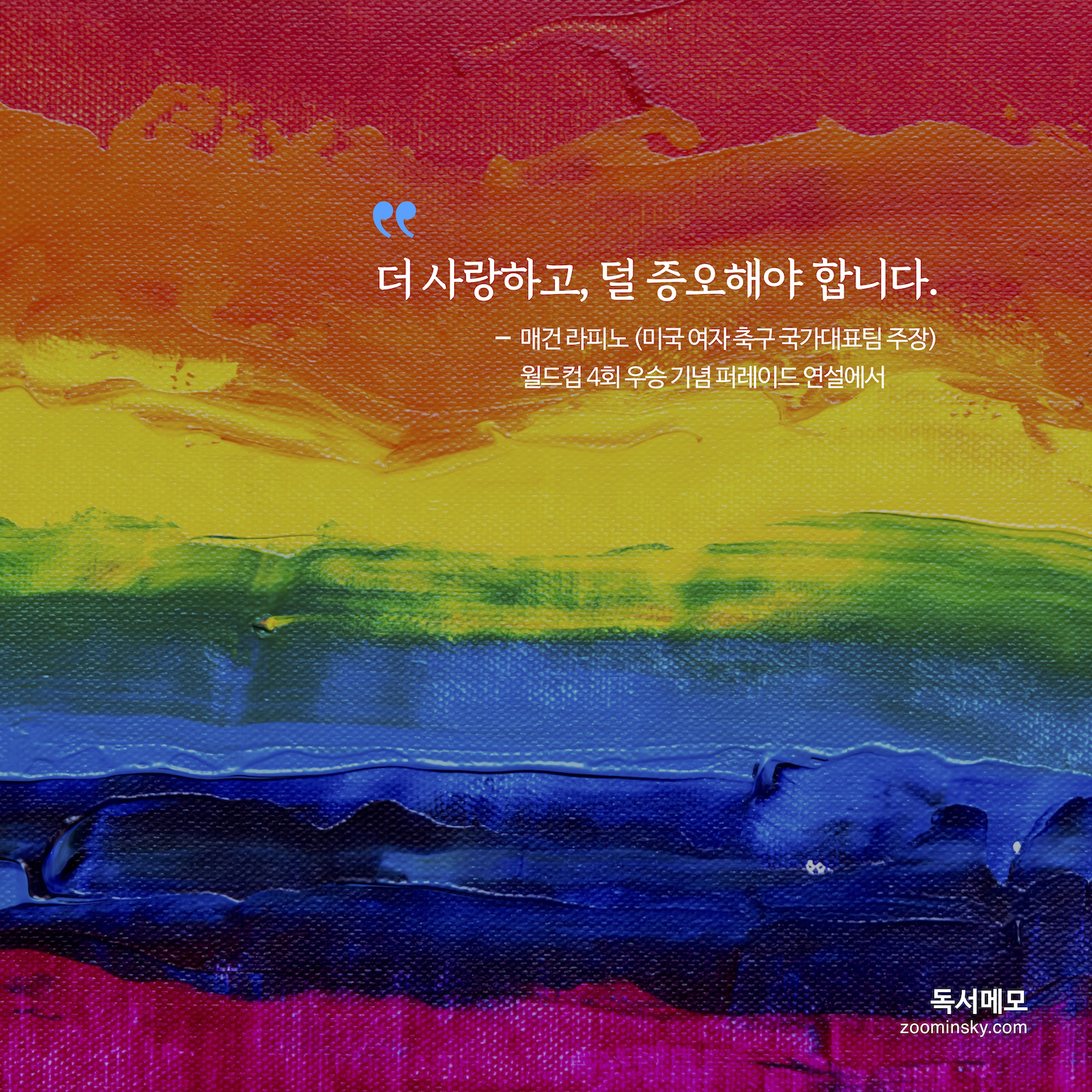 그 시대 사람들이나 지금 사람들이나 바뀐 것은 쓰고 있는, 살고 있는 물건과 환경만이지 인간이 느끼는 세상만사는 모두 똑 같다고 생각한다. 그런 의미에서 며칠 전 매건 라피노라는 미국 여자 축구대표팀 주장의 월드컵 우승 기념 퍼레이드 중에 한 연설은 시대를 초월하는 진리를 담고 있다. 예수님의 말씀이 2천년을 넘어 진리처럼 우리에게 다가온 느낌이었다.