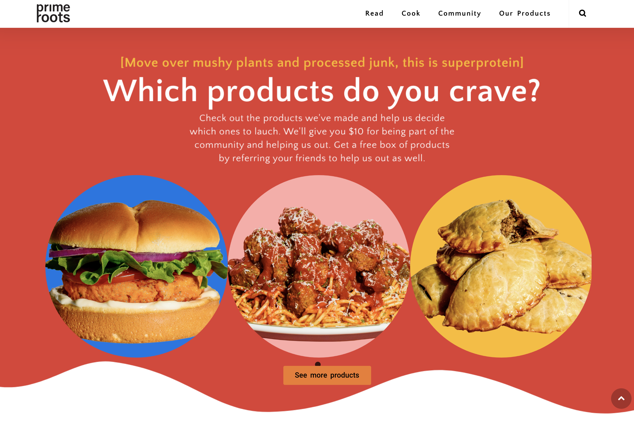 프라임 루츠는 발표 과학과 '치킨텐더', '베이컨', '랍스터', '튜나 덩어리', '크랩 케이크' 등의 완전 채식에 사용되는 슈퍼 단백질을 기반을 만들기 위한 다양한 곰팡이의 사용에 집중하고 있다.