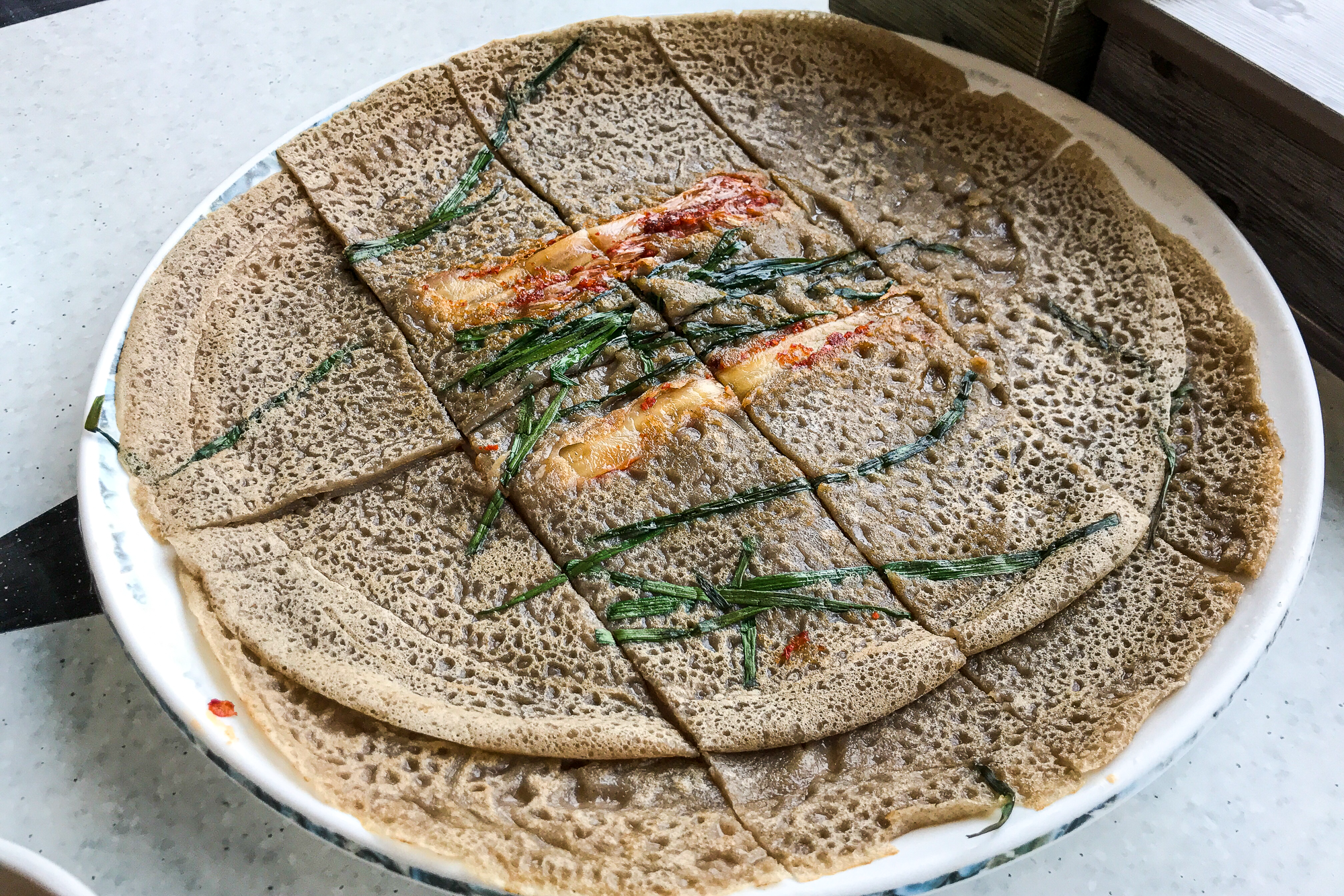 메밀전은 메밀가루를 물에 풀어 반죽을 만든 후 신김치와 파 등을 길게 늘여 놓고 메밀 반죽을 그 위에 뿌려 얇게 부쳐낸 우리 전통음식 중 하나.