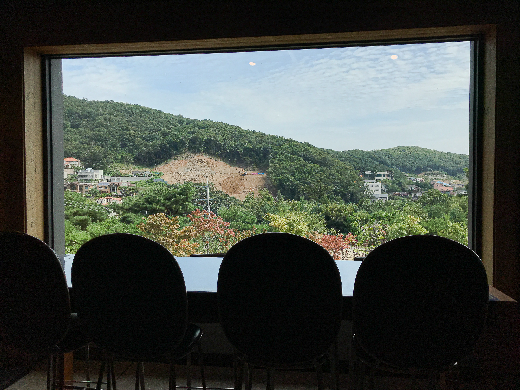 주문하고 2층으로 올라가면 테라스가 있는 넓은 곳이 나옵니다. 여기가 앉아서 커피를 마시는 곳이고 벽이나 구분은 없고 전체 공간이 트여 있어서 상당히 넓게 느껴집니다. 가게 뒷편도 나무고 전망도 산이 보여서 아주 좋습니다.