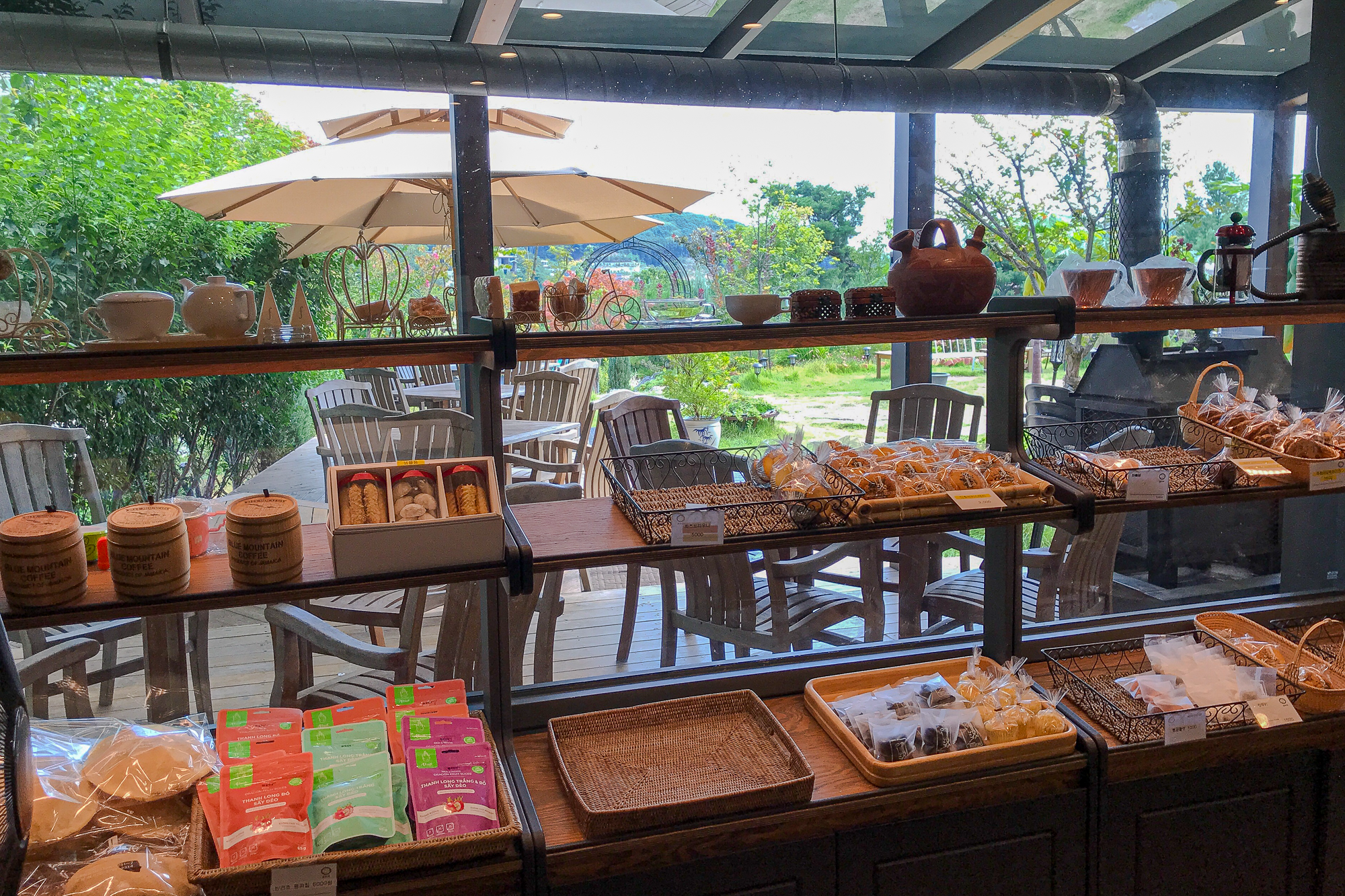 주문하고 2층으로 올라가면 테라스가 있는 넓은 곳이 나옵니다. 여기가 앉아서 커피를 마시는 곳이고 벽이나 구분은 없고 전체 공간이 트여 있어서 상당히 넓게 느껴집니다. 가게 뒷편도 나무고 전망도 산이 보여서 아주 좋습니다.
