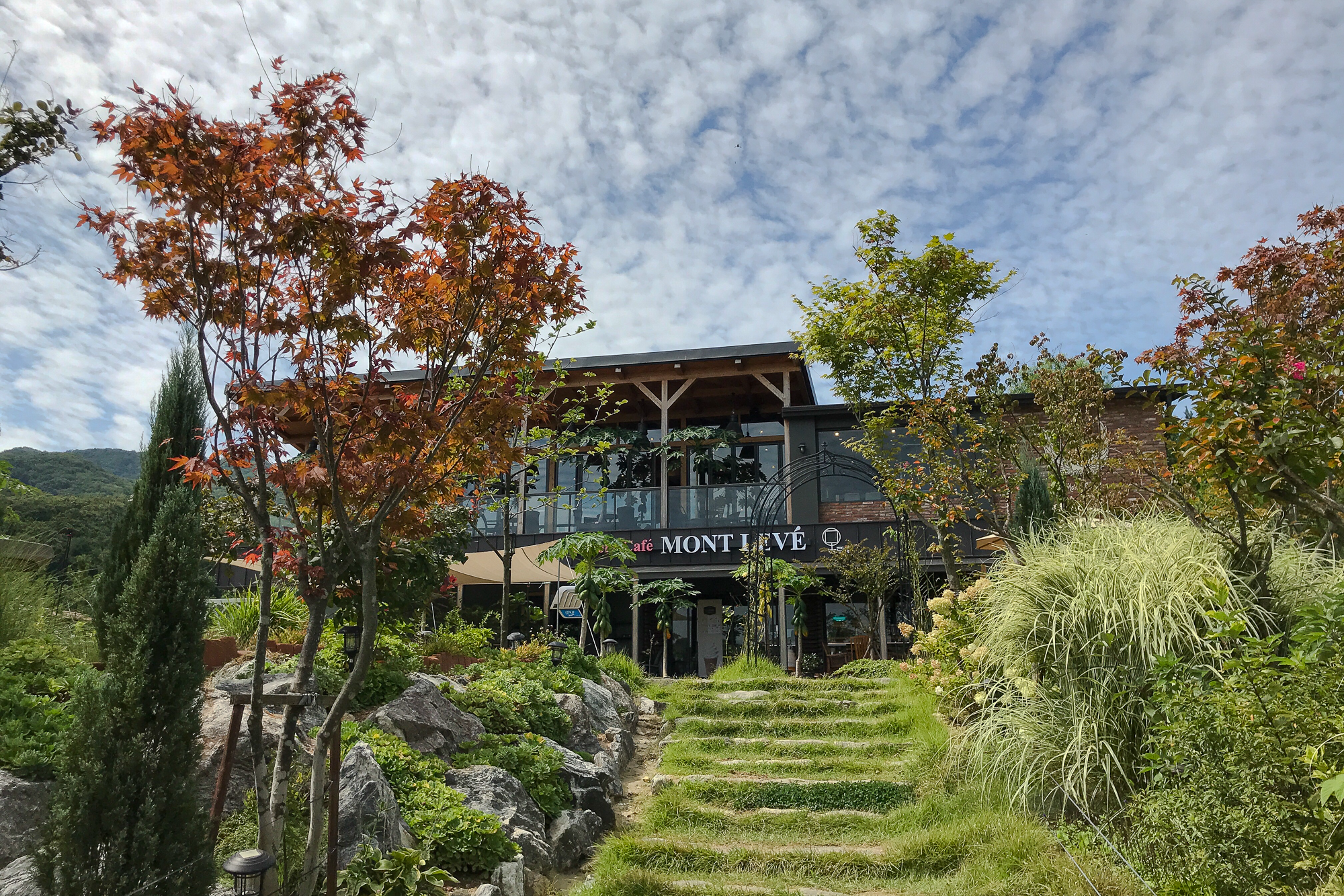 여름의 거의 끝무렵에 찾아갔던 곳 고기리에 있는 카페 몽르베입니다. 주차장이 잘 정리 되어 있고 넓은 편입니다. 아마 휴일에는 이곳이 거의 다 차지 않을까 싶은데 상당히 넓습니다.