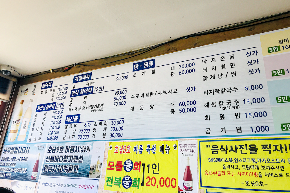 길에 간신히 주차를 하고 나름 골라 들어간 곳이 호남9호회스페셜이라는 집이다. 다들 거기서 거기인 듯보였다. 늦은 점심이어서 자리가 꽤 있을 거라고 생각했는데 한 가득이다. 간신히 차리 하나를 차지하고 앉았는데 가게가 너무 지저분하다. ㅜ.ㅜ 식당이고 명색이 횟집인데 뭐가 이렇게 지저분한가 싶을 정도로 말이다.