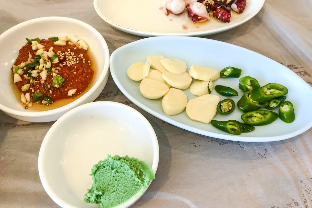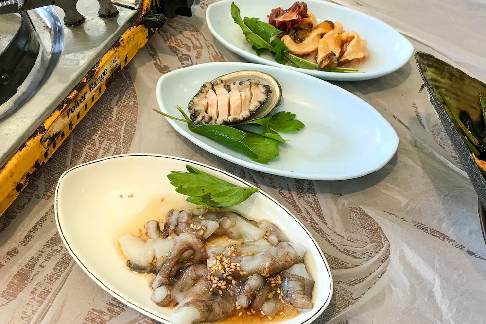 요렇게 낙지와 전복 1개, 멍개와 문어 조금이 차려진다. 요것들은 언제 어떻게 먹어도 기본은 하는 녀석들 나름 사람이 많아서 그런지 회전이 잘되어 신선한 느낌이다.