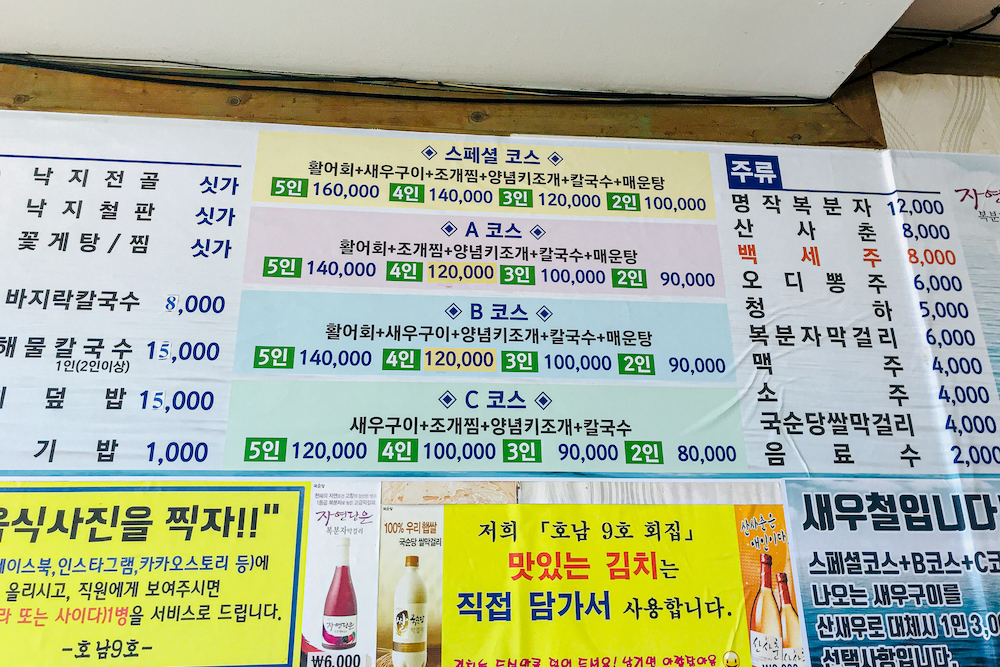 길에 간신히 주차를 하고 나름 골라 들어간 곳이 호남9호회스페셜이라는 집이다. 다들 거기서 거기인 듯보였다. 늦은 점심이어서 자리가 꽤 있을 거라고 생각했는데 한 가득이다. 간신히 차리 하나를 차지하고 앉았는데 가게가 너무 지저분하다. ㅜ.ㅜ 식당이고 명색이 횟집인데 뭐가 이렇게 지저분한가 싶을 정도로 말이다.