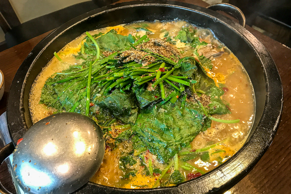 2인분의 오리전골이 등장한다. 점심 메뉴인 것으로 아는데 부추와 각종 채소가 듬뿍 들어가고 들깨도 듬뿍 들어간다. 냄새가 이쯤되면 순댓국과 추어탕 그리고 거기에 보신탕을 조금 섞은 듯한 이상야릇한 향연이 펼쳐진다.