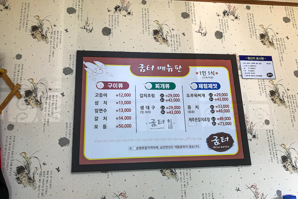 굼터의 메뉴판이다. 구이와 찌개 그리고 아주 비싼 제철 제맛 이렇게 세 개의 카테고리로 메뉴가 구성되어 있다. 구이는 약간 호불호가 있다. 대체로 고기는 큰 생선이 나오는데 굽는 기술이 조금 들쭉날쭉한다. 내가 갔던 날은 임연수의 껍질을 태워서 영 아니었는데 반찬 맛을 보고 화를 풀었다.