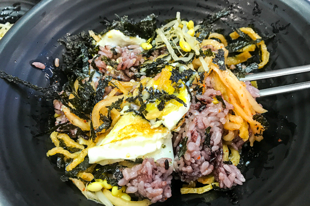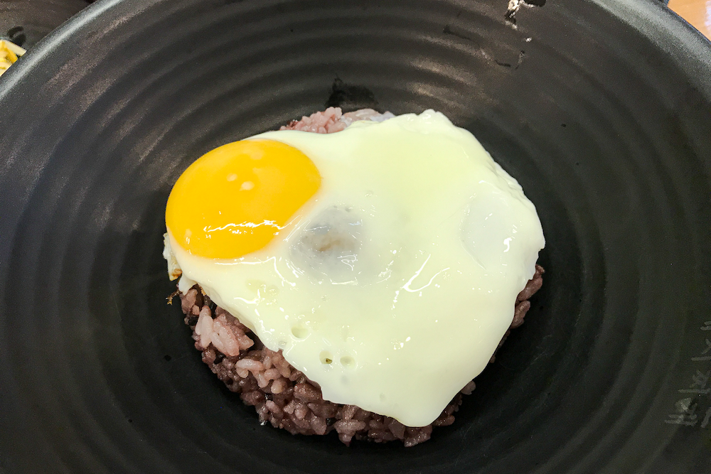 밥은 흑미밥이 나오고 그 위에 계란 후라이를 하나 올려준다. 반찬들은 체인점답게 아주 쏘쏘. ^^