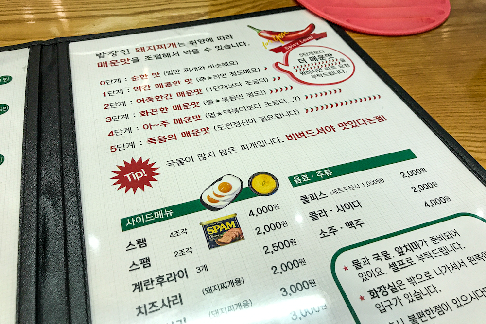 밥장인돼지찌개의 독특한 점은 매운맛의 단계를 조절하는 것이 가능하다고 한다. 이때 겁이 나서 2단계를 먹었더니 ㅜㅜ 매운 거 못 드셔도 3단계는 가능할 듯하다. 밥장인 돼지찌개와 계란 후라이가 같이 나오는 세트를 주문하고 스팸을 사이드 메뉴로 추가했다.