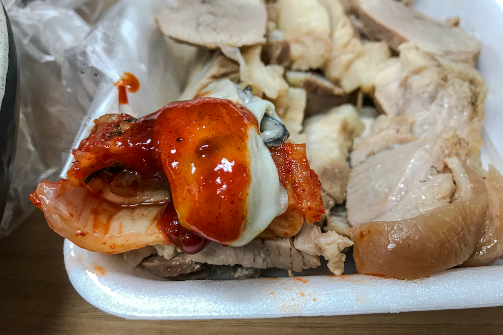 이것이 진미보쌈의 보쌈김치이다. 진미보쌈이 좋은 이유는 바로 이 김치 덕분이다. 김치가 정말 담백하고 시원하다. 고기와도 잘 어울리고, 함께 사갔던 굴과도 기가 막히게 잘 어울린다. 역시 보쌈은 김치가 살린다.