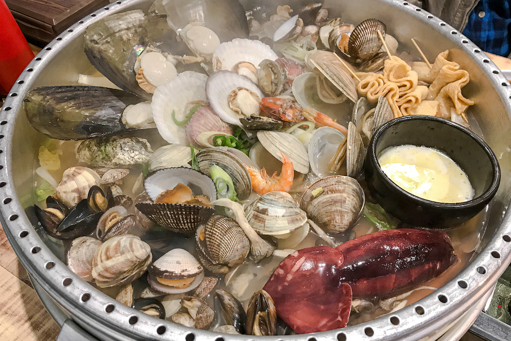 통오징어와 키조개가 눈에 띄고 꼬막들과 동죽, 홍합, 모시조개 등 다양한 조개들이 함께 전골이 되어 등장한다. 조개들은 비교적 해감이 잘되어 있어 먹기는 편하다. 택이네의 장점은 순환이 빠른지 조개들이 비교적 신선하게 느껴지는 것이다. 위에 보이는 전골은 가장 작은 것을 시킨 것이다. 여기에 바닷가재나 문어 등 고급스러운 재료도 추가가 가능하다. 물론, 추가 요금은 장난 아니지만.