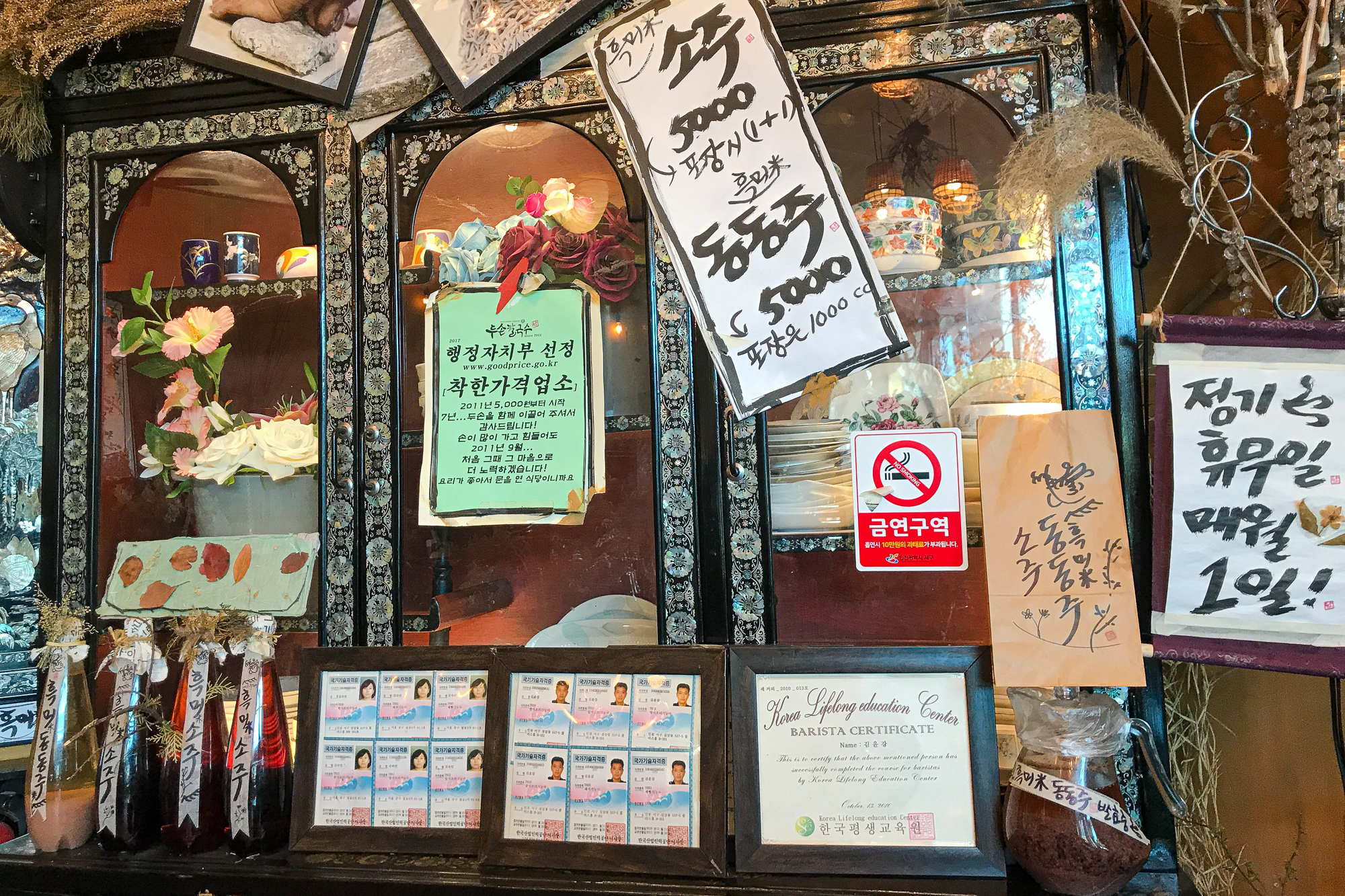 세트 메뉴를 주문했다. 보쌈과 손칼국수 과연 어떤 모습일까? 무척 궁금해진다. 보통 바지락 칼국수나 팥칼국수를 좋아하는 입장에서 여기 손칼국수는 과연 무엇일지? 거기에 보쌈이 과연 어울릴지가 궁금했다. 위 사진에 보이는 착한가격업소라는 상장같은 것이 눈에 확 띈다. 그 밑에는 주인장 부부의 자격증도 보이고 바리스타 공부도 하신 듯. 하여간 독특한 주인장 부부인 듯하다.