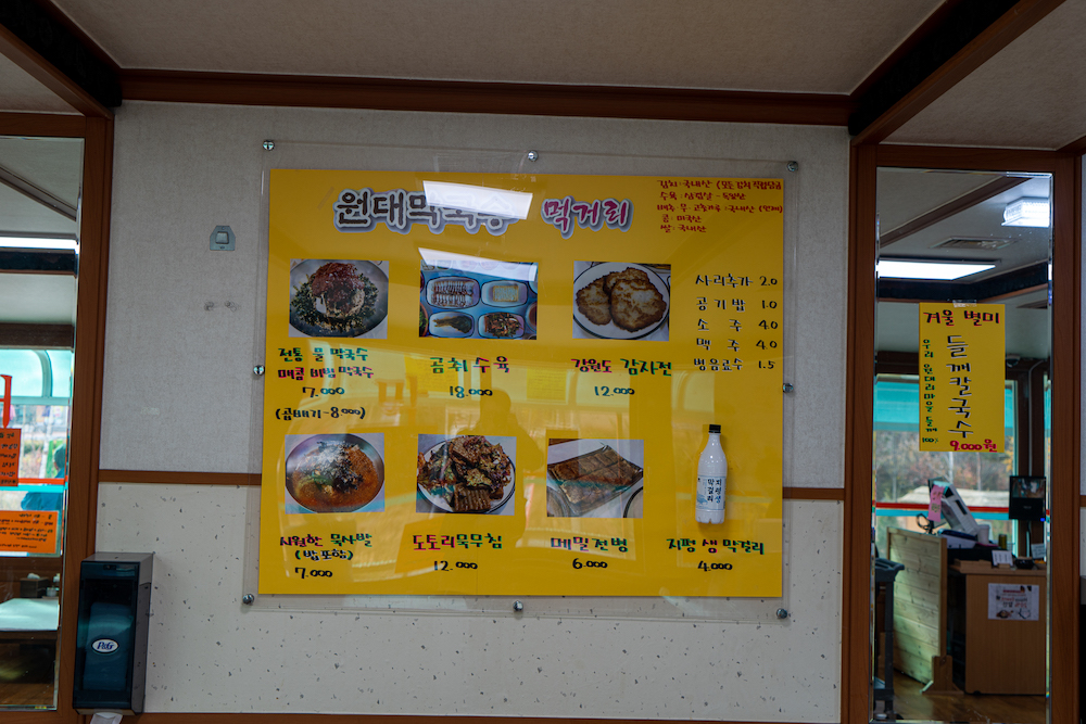 여러 번 방문을 했었으니 맛은 보장한다. 대부분의 메뉴가 모두 훌륭한 편인데 처음 간다면 반드시 막국수(비빔)와 곰취수육을 드시길 권한다. 이게 원대막국수의 시그니처이다. 감자전과 도토리묵무침도 아주 괜찮다. 그다음으로는 메밀전병, 묵사발 순서이다. 물론 아주 지극히 개인적인 취향이라는 점은 이해해주시리라 믿는다.