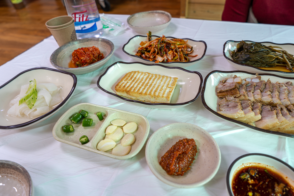 반찬 나오는 것은 꾸준하다. 몇 년을 갔는데 올 때마다 그냥 복사/붙이기 한 것 같은 상차림이다. 파절이도 좋고, 무말랭이도 아주 맛나다. 특히 처음 갔던 날은 오버를 해서 저 두부를 세 번인가 리필해서 먹었다. 국수가 나오기 전에 곰취와 편육을 상추쌈에 올려 마늘 하나, 고추 하나 올려서 새우젓과 파절이를 같이 먹으면 예술이다. 특히 아주 맛난 곰취 피클이 수육의 맛을 살려준다.