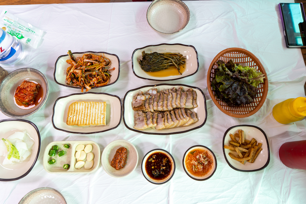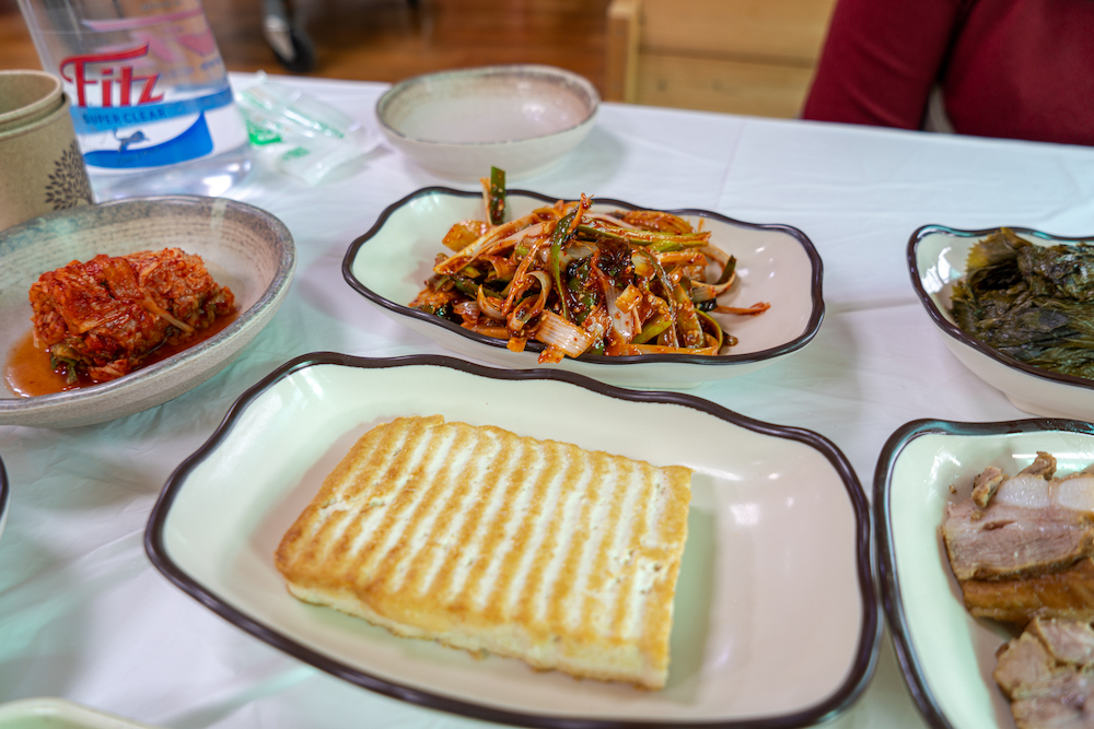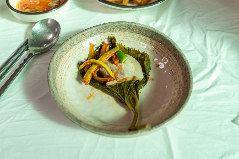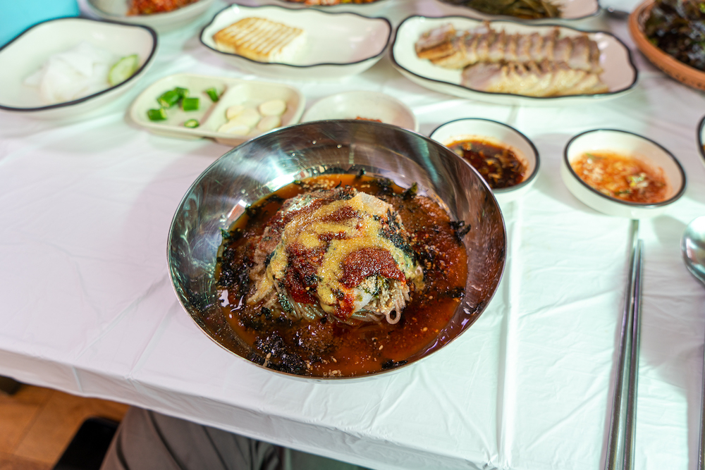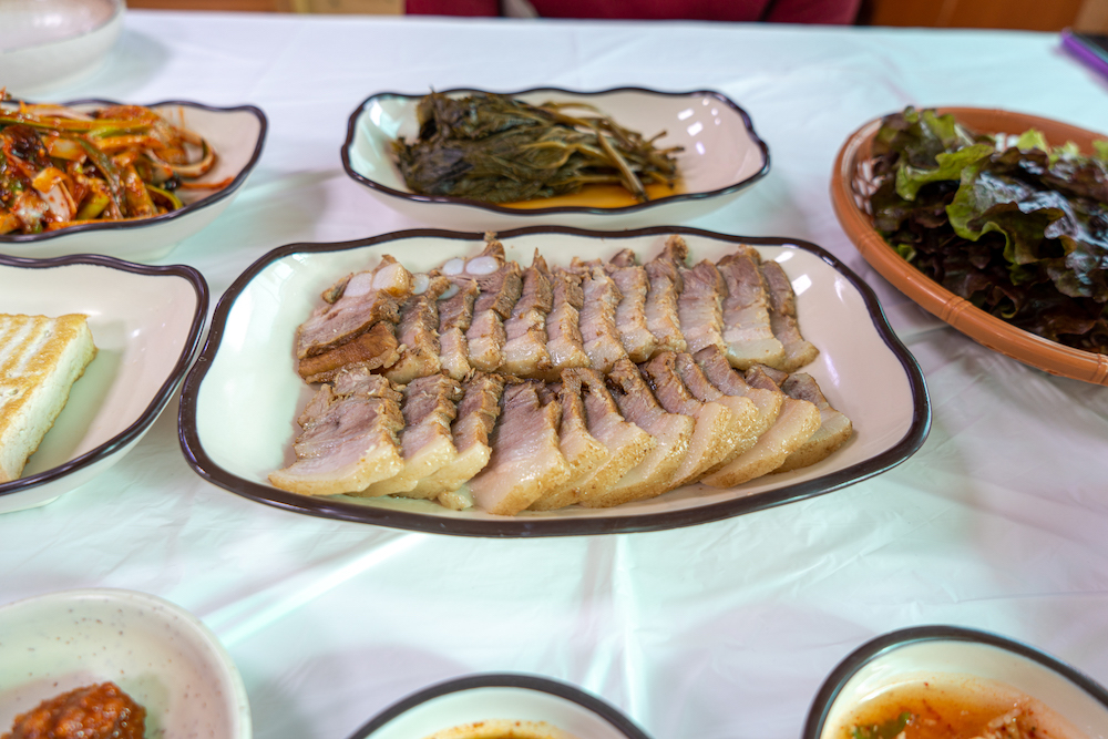 반찬 나오는 것은 꾸준하다. 몇 년을 갔는데 올 때마다 그냥 복사/붙이기 한 것 같은 상차림이다. 파절이도 좋고, 무말랭이도 아주 맛나다. 특히 처음 갔던 날은 오버를 해서 저 두부를 세 번인가 리필해서 먹었다. 국수가 나오기 전에 곰취와 편육을 상추쌈에 올려 마늘 하나, 고추 하나 올려서 새우젓과 파절이를 같이 먹으면 예술이다. 특히 아주 맛난 곰취 피클이 수육의 맛을 살려준다.