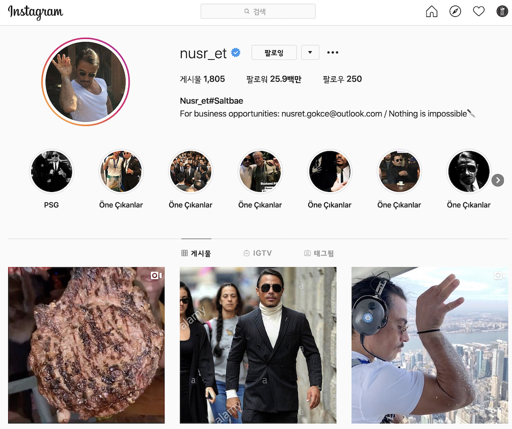 그런데, 누스렛 인스타그램에 들어가면 누스렛 고체라는 셰프의 퍼포먼스와 독특한 분위기를 느낄 수 있습니다. 스테이크를 써는 모습 그리고 소금을 뿌리는 그만의 시그니처 같은 행동 그리고 그걸 칼에 콕 찍어서 옆에 있는 미녀의 입에 넣어주는 행동까지 모든 게 화려합니다. 제가 볼 때는 좀 저렴해 보이는데 외국에서는 그게 먹히는 모양입니다.