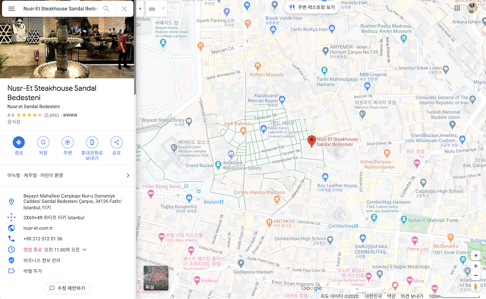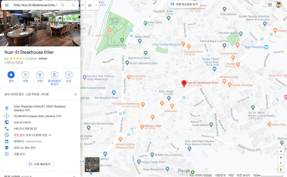 터키에는 누스렛 스테이크하우스가 본점을 포함해 3곳. 버거하우스가 3곳 정도 됩니다. 이 중에서 스테이크하우스를 가셔야 할 텐데, 본점은 Etiler에 있는 곳이라고 하네요. 대부분은 이곳을 추천하는데 교통이 좀 어렵다고 하네요. 그리고 구글 지도에는 잘못 표기가 되어 있으니 꼭 확인하고 택시를 타더라도 타고 가셔야 합니다. 아래 구글 지도는 제대로 된 것이니 이걸 보시고 가세요.