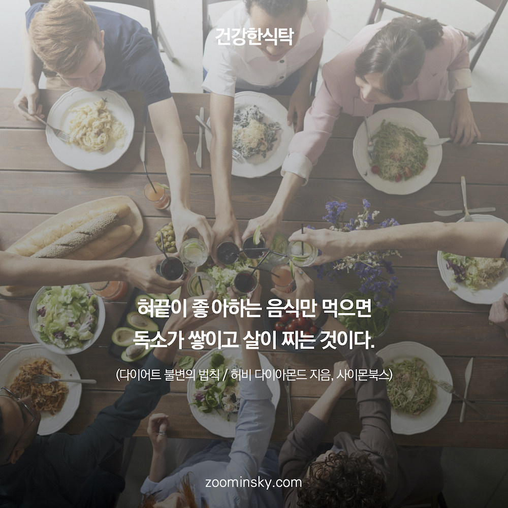"혀끝이 좋아하는 음식만 먹으면 독소가 쌓이고 살이 찌는 것이다. 음식을 즐기지 말라고 하는 것이 아니다. 맛 좋은 음식을 먹되 몸이 원하는 것을 먹으라는 것이다. (허비 다이아몬드의 다이어트 불변의 법칙 중)"