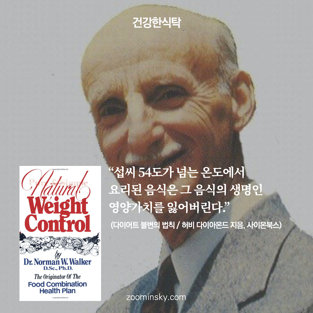허비 다이아몬드 박사의 <다이어트 불변의 법칙> 중에는 체중 조절 아니 잘 먹고 잘 살기 위한 다양한 조언이 등장한다. 그 가운데 수분이 많은 음식을 섭취하는 것이 좋다는 조언과 함께 등장하는 에피소드가 바로 노만 워커(Norman W. Walker) 박사의 저서 '자연적 체중조절 Pure & Simple Natural Weight Control(1981)'에 나오는 이야기이다. 얼마나 중요하다 싶었는지 4문단을 원문 그대로 인용했다.