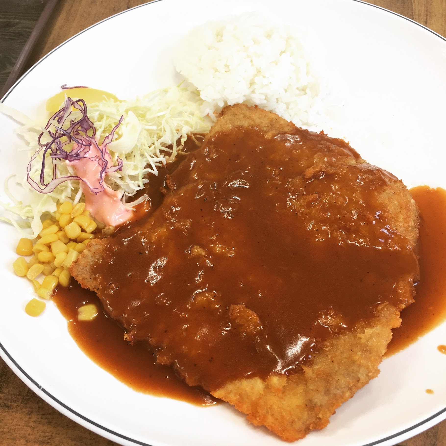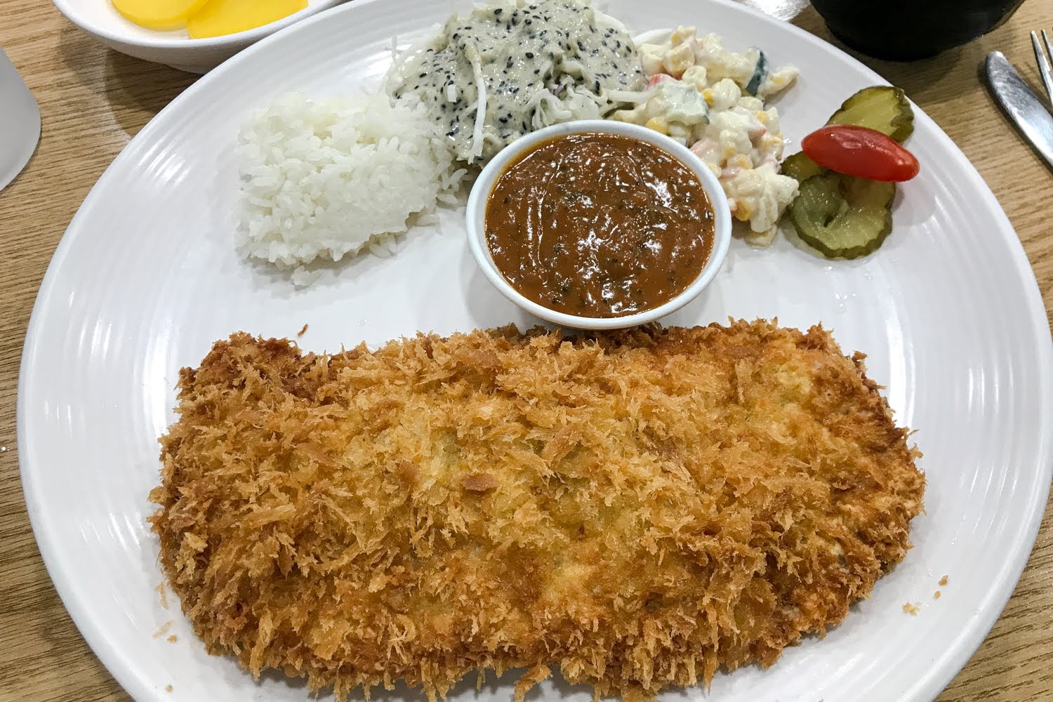 일단 한국식 돈가스는 커야 했다. 그래서 머리를 쓰다 보니 두께를 넓게 펴서 돈가스를 크게 보이게 하는 마술을 부렸다. 그래서 얼굴보다 큰 왕돈가스가 등장했고, 그 사이드에는 고추와 깍두기가 자리를 잡았다. 이렇게 해서 완벽히 돈가스가 반찬과 같은 역할을 수행하게 되었고, 식품 산업의 발전에 따라 간편하게 해동해 튀기면 먹을 수 있는 레디쿡 돈가스가 유통되기 시작하면서 학교 식당이나 단체 급식에서도 이제는 돈가스를 쉽게 만날 수 있게 되었다.