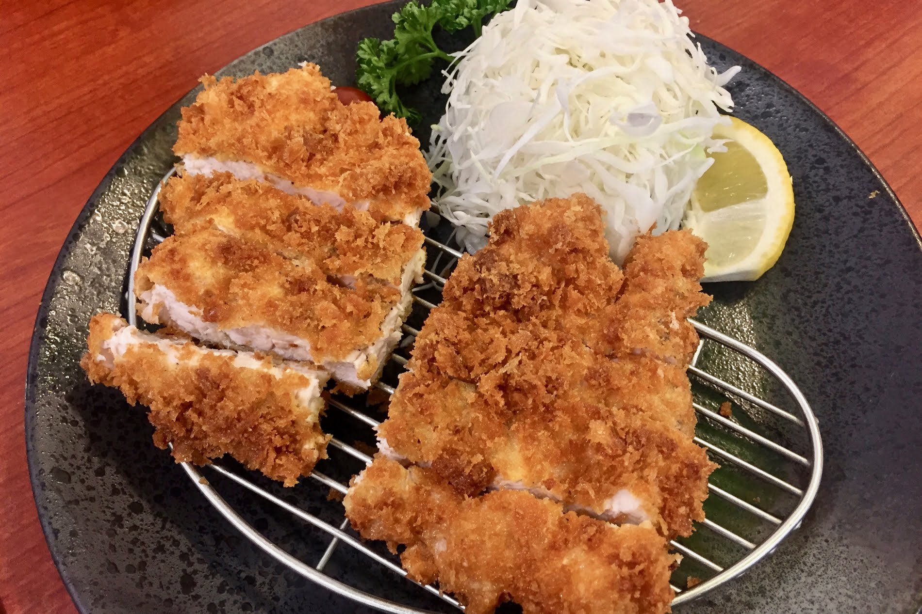 일단 한국식 돈가스는 커야 했다. 그래서 머리를 쓰다 보니 두께를 넓게 펴서 돈가스를 크게 보이게 하는 마술을 부렸다. 그래서 얼굴보다 큰 왕돈가스가 등장했고, 그 사이드에는 고추와 깍두기가 자리를 잡았다. 이렇게 해서 완벽히 돈가스가 반찬과 같은 역할을 수행하게 되었고, 식품 산업의 발전에 따라 간편하게 해동해 튀기면 먹을 수 있는 레디쿡 돈가스가 유통되기 시작하면서 학교 식당이나 단체 급식에서도 이제는 돈가스를 쉽게 만날 수 있게 되었다.