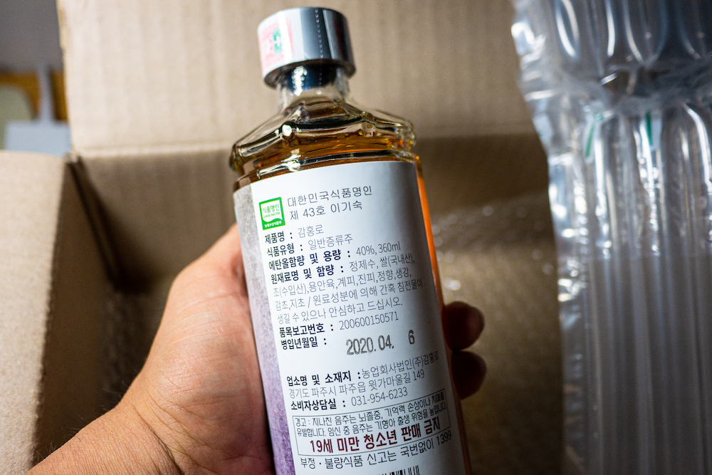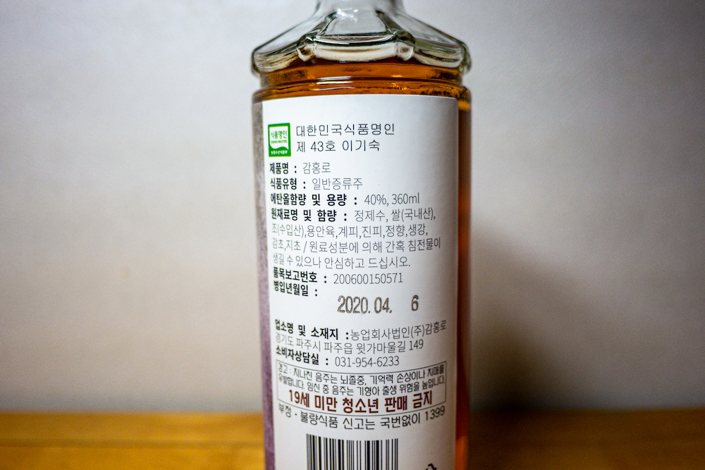 구매한 제품은 360ml 유리병 제품으로 나름 보급형인 듯하다. 원래 감홍로는 700ml 도자기에 담긴 것이 제대로인데 일단 처음 맛보기 위해 유리병 보급형을 샀다. 도수는 40도 가격은 36,000원이다. 구매는 당연히 전통주 우리술이므로 온라인으로 샀다.