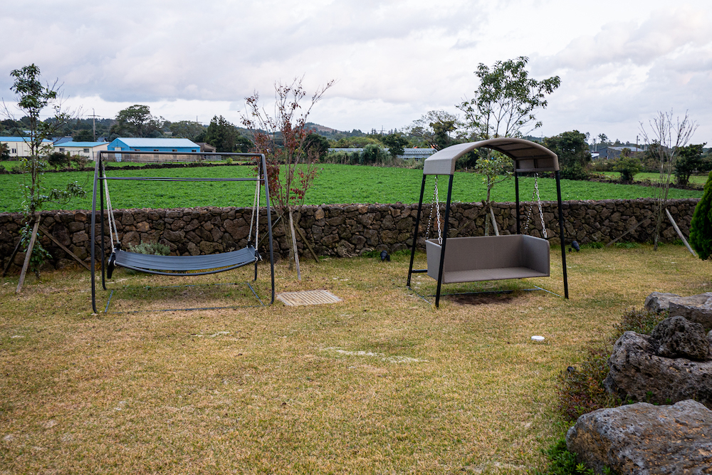 마당에는 아이들이 뛰어놀 수 있는 트랜블린과