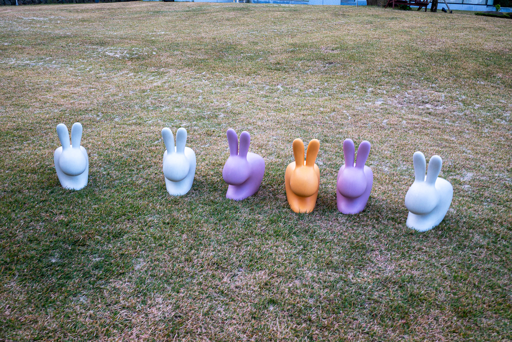 건물 앞에 있는 작은 토끼 인형이 앙증맞다