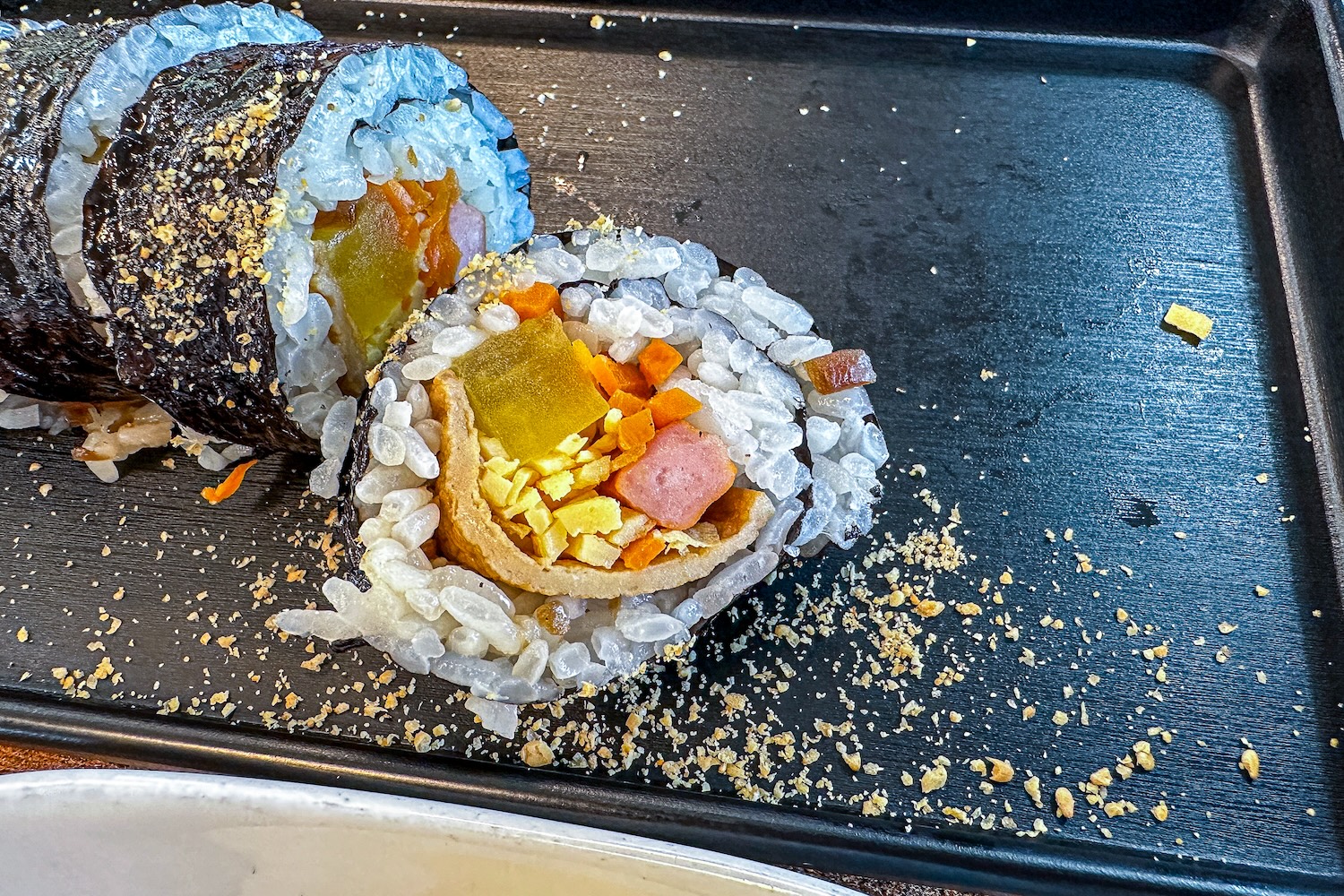 김밥은 아주 노멀하다. 속에 들어간게 단무지와 당근, 계란과 소시지, 오뎅 그리고 우엉이 아주 조금. 그런데 이게 문제가 깨가 너무 많이 뿌려져서 먹을 때 좀 까칠거린다. 내가 주인장이면 차라리 밥에 이 깨와 소금을 살짝 섞으면 훨씬 맛이 날텐데 조금 아쉽다. 이 비법은 우리 어머니 비법이시다. 어린 시절 소풍갈 대 따끈한 밥에 깨와 소금을 뿌려서 비벼 밥에 맛있게 간을 해주셨는데 난 그게 그렇게 맛났다. 아직도 누구도 그렇게 김밥 하는 것을 못봤다. 조만간 집에서 그렇게 해 먹어봐야겠다는 생각이 불현듯 이 글을 쓰면서 생각이 났다.