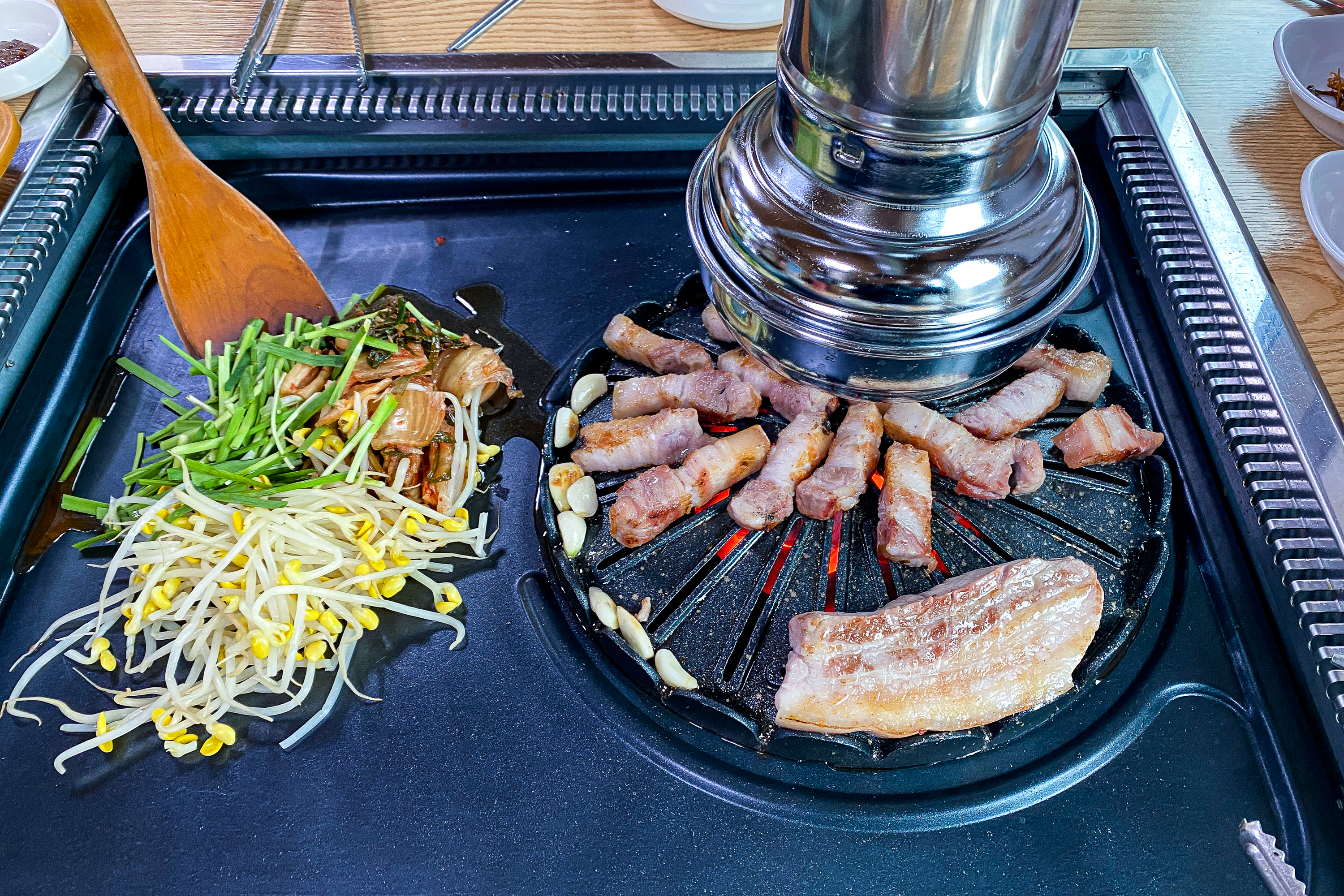 한쪽에서는 묵은지와 부추 그리고 콩나물을 올려 굽는다