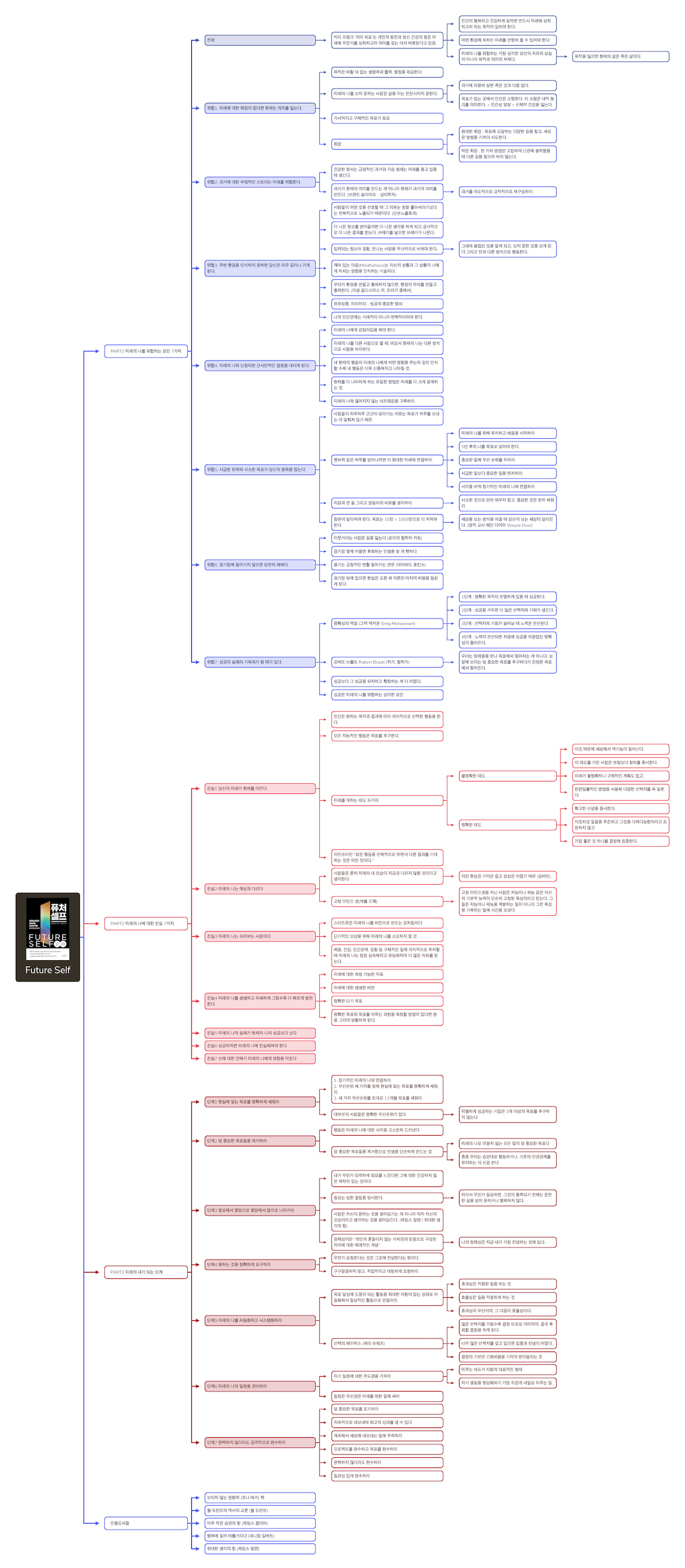 벤저민 하디라는 작가는 조직심리학자로 자기계발 분야의 파워블로거이고 유튜버라고 한다. 미래의 나를 삶에서 가장 중요하게 타게팅해야 한다는 것이 핵심이고 스토리의 전부이다. 역시 이런 종류의 책은 서양적인 시각에서 쓰여진 것들이 정말 우리 사회에 적용하기가 쉽지 않다. 구태여 이야기가 어렵지도 않으니 딱히 내용을 더 깊게 살펴볼 필요가 없기도 하지만, 그냥 목차 정도만 읽어도 될 정도이다. 목차가 좋아서 내용에도 뭔가 있겠지 싶었는데 없다. 그나마 몇개 정리해서 마인드맵에 옮겨놓았다.