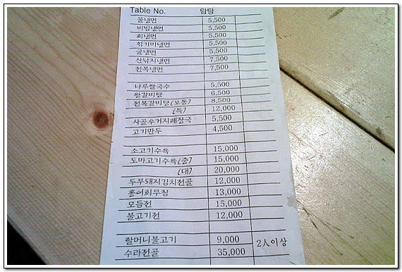 안에는 오래된 전달들이 민벽에 덕지덕지 붙어있고 탁자도 나무로 만든 어설픈 탁자가 자리하고 있습니다. 얼핏보면 좀 허술해보이기도 하고 말이죠. 하지만 뭐.. 분위기도 분위기지만 일단 음식점은 무조건 맛이 좋아야겠죠.. ^^