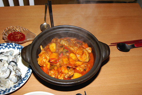 이제 야채가 어느 정도 익었다고 생각되면 오븐에서 나온 닭을 넣고 한번 더 익혀줍니다. 야채들과 섞어가면서 닭도 적당히 익혀주는 것이 좋죠.. ^^ 이제 마지막으로는 닭과 야채가 적당히 익었다고 생각되면 물을 넣고 간을 맞춰야 합니다. 물론 닭볶음탕이니 당연히 간은 고추장으로 해야겠죠.. ^^ 고추장을 넣고 마치 카레처럼 저어주다보면 예전에 어머님이 해주시던 먹음직스럽던 붉은빛 닭볶음탕이 되어가더군요.. 전 여기서 잔재주를 부렸습니다.