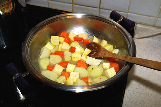 닭이 오븐에서 열심히 익고 있는 동안 재료를 먹기 좋게 썰고 그다음은 냄비에 올리브유를 두른 후 고구마와 감자 그리고 당근을 넣고 볶아줍니다. 볶다보면 냄비에 너무 붙는 경우도 있는데 어느 정도 익었다고 생각되면 물을 조금씩 넣으며 자잘자잘하게 계속 야채들을 익혀주시면 좋습니다. 여기서의 핵심은 야채들이 너무 물에 많이 잠기면 그 맛이 물로 빠져버리기에 물은 최소로 야채의 상큼한 맛이 날 정도로 익혀주는 것이 중요한 노하우인 것 같습니다.