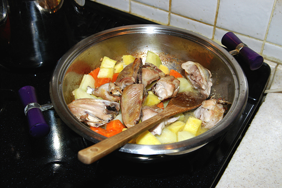 이제 야채가 어느 정도 익었다고 생각되면 오븐에서 나온 닭을 넣고 한번 더 익혀줍니다. 야채들과 섞어가면서 닭도 적당히 익혀주는 것이 좋죠.. ^^ 이제 마지막으로는 닭과 야채가 적당히 익었다고 생각되면 물을 넣고 간을 맞춰야 합니다. 물론 닭볶음탕이니 당연히 간은 고추장으로 해야겠죠.. ^^ 고추장을 넣고 마치 카레처럼 저어주다보면 예전에 어머님이 해주시던 먹음직스럽던 붉은빛 닭볶음탕이 되어가더군요.. 전 여기서 잔재주를 부렸습니다.