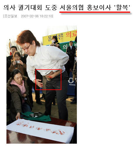 정말 할복이 뭔줄 알고들 언론들에게 할복이라는 표현을 쓰시나요? 제가 볼땐 자해지 결코 저걸 할복이라고 표현하기에는 무리가 있습니다. 배를 가름과 배에 상처를 냄은 분명히 다른 상황입니다. 마치 사무라이 영화의 한장면 같은 꼭 표현을 써도 일본식으로 할복... 아.. 정말 짬뽕 100 그릇 납니다...