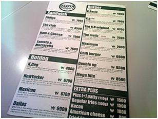 일단 이 집의 주 메뉴는 버거(Buger) 그리고 샌드위치와 핫도그다. 그런데 가격이 장난이 아니다. 최고로 비싼 햄버거가 8,500원 가장 베이직이 4,900원이다. 여기에 보통 음료를 함께 먹어야 하니 그 추가요금을 생각해보면 성인 1인 기준으로 최소 1만원이 훌쩍 넘게 된다. 이거야 원 이건 럭셔리해도 상당히 럭셔리하지 않은가? 아.. 물론 이것보다 더 비싼 호텔식 햄버거도 있겠지만 말이다.. ^^
