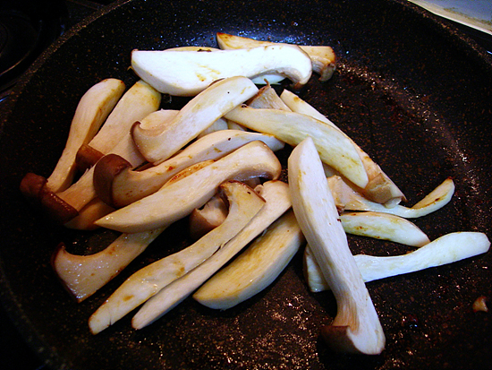이제 후라이팬에 버터를 조금 두르고 닭 가슴살을 올려놓습니다. 겉이 노릇해질 때까지 골고루 익혀줍니다. 적당히 겉이 익었다고 생각되면 오븐용기로 옮긴 후 호일로 덮어줍니다. 안 덮으면 탈 수도 있습니다. 그리고 오븐에 200도로 20분 정도 익혀주시면 됩니다. 그리고 닭 가슴살을 익힌 후라이팬에 송이버섯을 넣고 살짝 볶아줍니다. 그럼 적당한 육수와 버터 맛을 지닌 맛있는 버섯구이가 탄생하는데 요점은 너무 많이 익히면 맛이 떨어지니 살짝 익혀내는 것이 좋더군요.