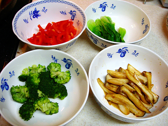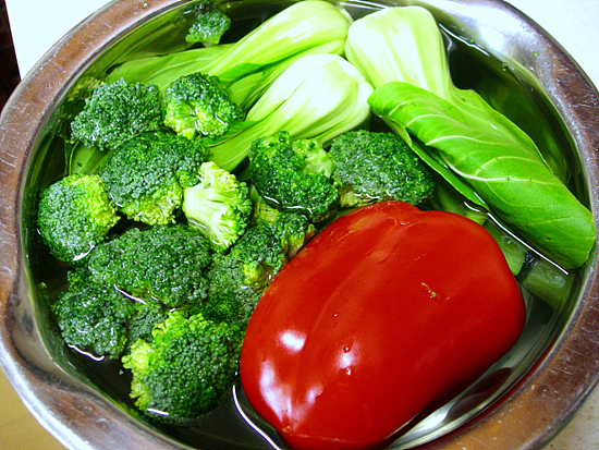 함께 먹을 야채를 잘 손질해서 깨끗하게 씻어야 합니다. 특히 소다를 조금 넣고 담가두면 좋다고 하더군요. 그리고 흐르는 물에 잘 씻어줍니다. 생각보다 간단하죠. 브로커리와 파프리카는 먹을 수 있을 크기로 썰어줍니다. 다음에는 끓는 물에 야채들을 살짝 데쳐내야 합니다. 청경채는 순이 살짝 죽을 때까지 잘 보다가 건져야 하고 브로커리는 좀 오래 삶듯이 해줘야 합니다. 물론 이 때 물은 약간 소금간을 해주시는 게 기본이죠. 파프리카는 그냥 먹을 생각에 먹기 좋게만 썰어 두었습니다. 야채모듬은 준비 되었고 이제는 메인 입니다.