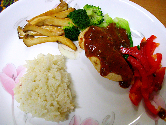 메인 요리 - 닭 가슴살 한 팩, 청경채, 송이버섯, 브로커리, 파프리카