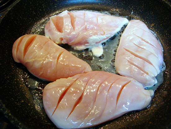 가슴살은 사전에 잘 씻어 놓고 레몬즙을 살짝 뿌려 듭니다. 소금이나 후추를 뿌릴 수도 있지만 최대한 맨 살(?)로 먹으려고 그냥 요리에 들어갔습니다. 먼저 할 일은 조금 깊숙하다 싶을 정도로 칼집을 내는 것. 생각보다 닭 가슴살은 두툼합니다. 칼집을 너무 소심하게 내면 나중에 익으면서 거의 칼집이 보이지도 않게 됩니다. 과감히 내야 합니다. ^^ 물론 자르면 곤란하겠죠..ㅋㅋ