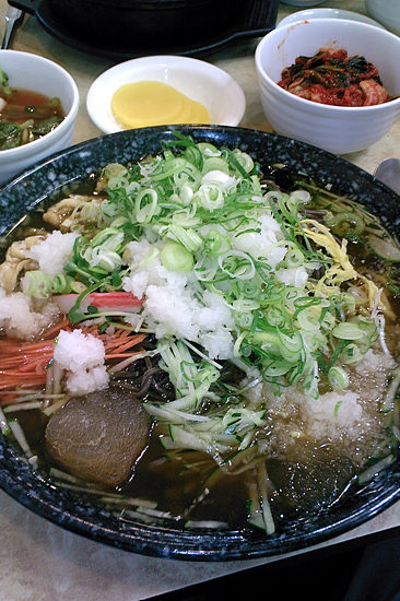오래 전에 장수분식 돌냄비우동이 맛있다고 해서 먹어봤던 기억이 어렴풋이 나지만 당시에는 크게 감동을 하지 못했던 게 사실입니다. 하지만 이번에 먹은 '쟁반메밀비빔'은 장난이 아니더군요. 큰 접시에 메밀과 얼음이 둥둥 떠 있는 시원한 국물 그리고 각종 야채가 범벅이 되어 나옵니다. 첫인상부터가 사뭇 감동적이죠. 늘 메밀국수 하면 작은 량과 따로 나오는 국물에 옮겨 찍어먹다 보니 자칫하면 메밀이 말라버리는 황당한 일도 발생합니다.