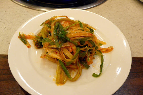 일단 고기를 살짝 구워 함께 주는 파 무침과 함께 먹게 되는데 솔직히 고기 맛의 진수를 보시려면 파는 좋지 않습니다. 그냥 소금을 조금 찍어 먹는 것이 고기 맛을 정확히 보는 방법입니다. 파를 함께 먹는 것은 돼지고기의 경우는 괜찮지만 소고기를 파와 함께 먹으면 그 깊은 맛을 파가 몽땅 가져가기에 훌륭한 궁합이라고 볼 수는 없습니다. 하지만 40년 전통이라니 한번 같이 먹어주었습니다.