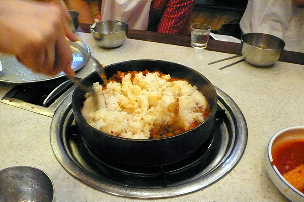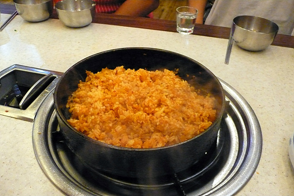 고기를 다 먹고 보통은 냉면이나 된장찌개에 밥을 먹는 것이 어느덧 우리 고기 먹는 문화의 정석이 된 듯합니다. 그런데 이 집에는 비장의 무기가 있더군요. 한국인 누구나가 좋아하는 김치볶음밥입니다. 근데 이게 우리가 생각하는 일반적인 김치볶음밥이 아닌 김치볶음죽스러운 밥입니다. ^^ 일단 고기를 다 먹은 솥에 먹다 남은 파를 넣고 기름기를 닦아냅니다. 그리고 가져온 김치와 여러 양념을 섞어 만든 김치볶음양념을 넣고 끓여줍니다. (그 동안 쟁반을 덮어 놓더군요.) 그럼 김치볶음양념이 보글보글 끓습니다. 김치는 아주 충분히 익은 김치를 쓰기에 향이 새콤합니다. 그렇게 양념이 푹 익으면 그 다음 밥을 넣고 비벼줍니다. 솔직히 볶는 다기 보다는 양념과 비벼준다고 하는 게 적당한 표현 같습니다. 그리고 살짝 불을 약하게 하고 먹어줍니다. 나중에는 바닥에 아주 맛있는 김치볶음밥 누룽지가 생겨서 먹는 즐거움을 더욱 키워주더군요. ^^